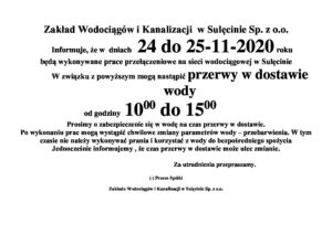 2020-11-23 Przerwa w dostawie wody w miejscowości Sulęcin.