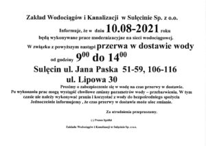 Dnia 10-08-2021 Przerwa w dostawie wody w miejscowości Sulęcin.